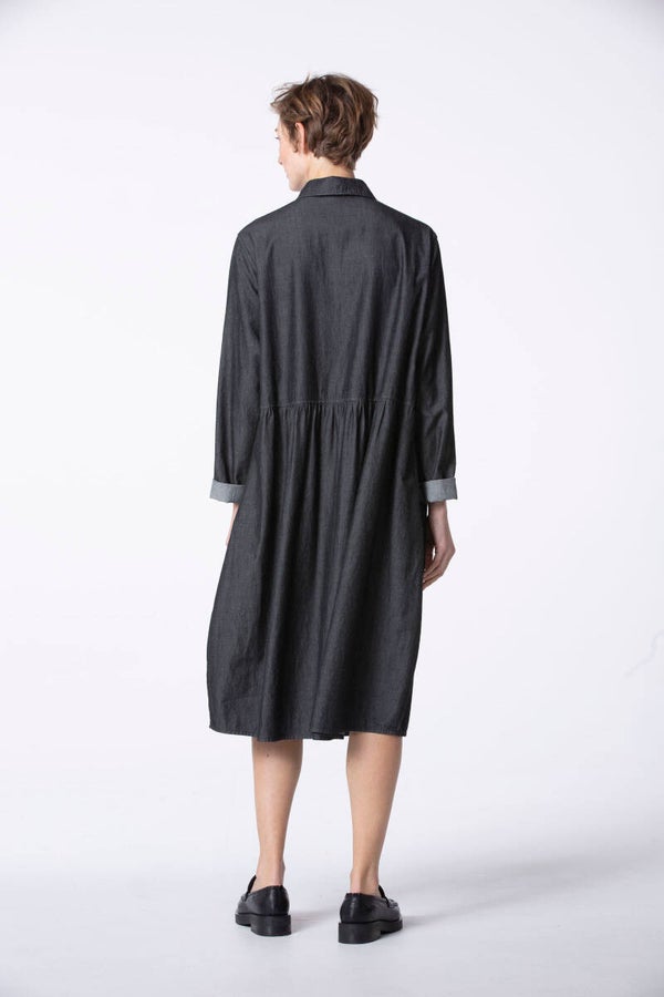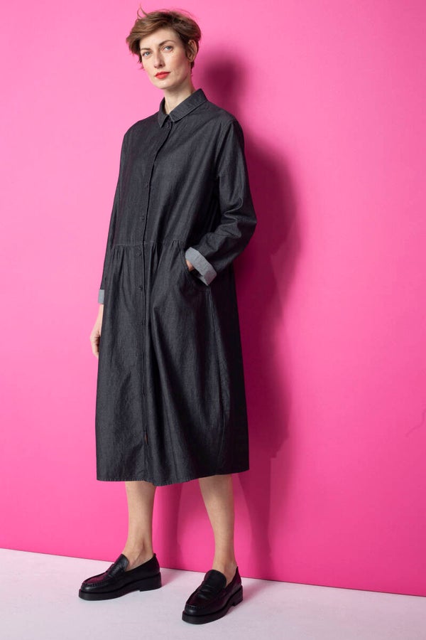 Das Midikleid Faaro wurde aus leichtem BCI Baumwoll-Denim mit dezenter Waschung gefertigt. Die leicht überschnittenen Schultern und eine geraffte Taillenpartie sorgen für eine feminine Silhouette. Ein Hemdblusenkragen und gerundete Taschen im typischen Denim-Look verleihen dem Kleid eine sportliche Note. Dank der durchgehenden Knopfleiste kann das Modell auch offen im Lagenlook zur Hose getragen werden.