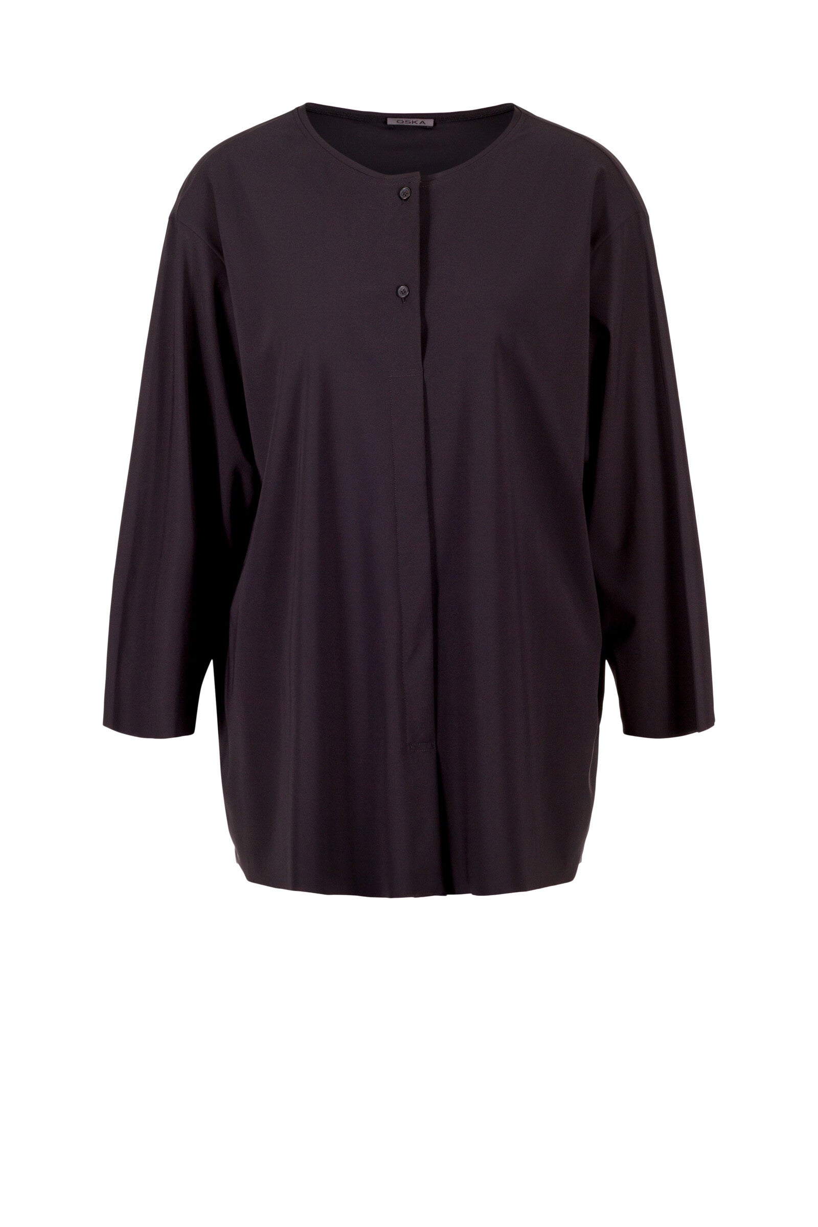 Diese Bluse ist ein modisches Highlight! Aus hochelastischem Hightech-Jersey aus Mikrofaser gefertigt, unterstreicht ein kastiger Schnitt den minimalistischen Look. Sie ist kragenlos, hat eine kurze Knopfleiste mit tiefer Falte und Schlitzdetail am Saum. Für ein lässiges Outfit kombinieren Sie sie zur Hose aus dem selben Stoff. Dieses Material ist knitterfrei und eignet sich damit perfekt für Reisen.