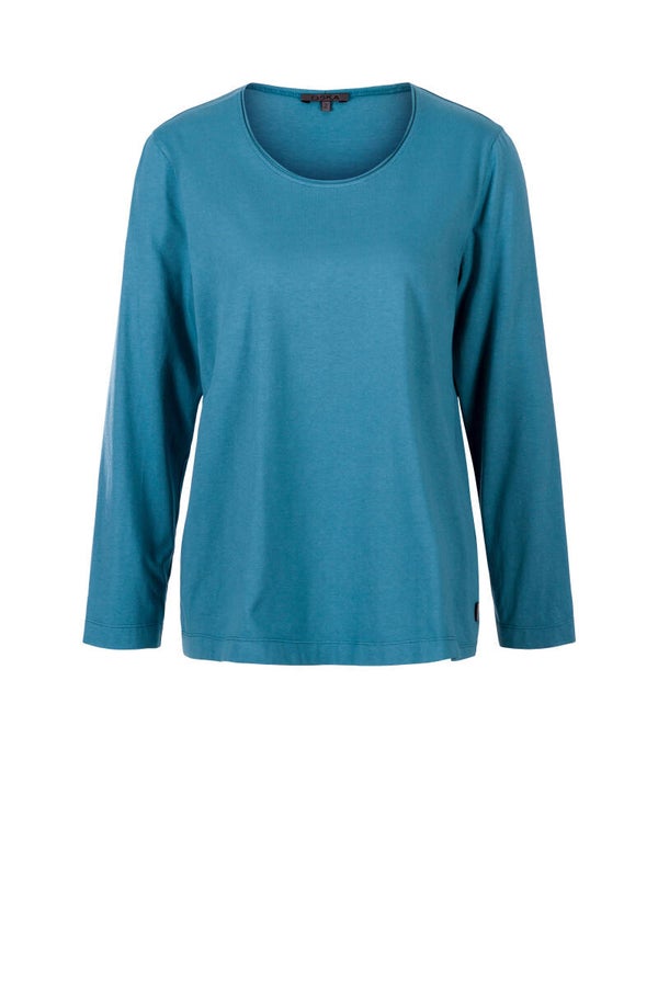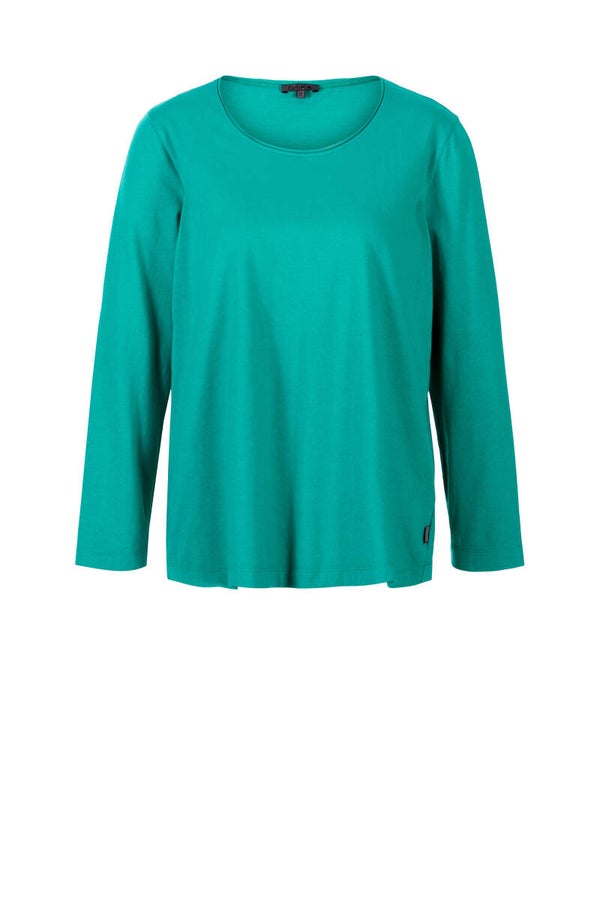 Dieses langärmelige Hemd besteht aus weicher Bio-Baumwolle mit glatter Verarbeitung. Seine langen Ärmel und der etwas A-Linien-Schnitt machen ihn zu einem zeitlosen Must-have in der Garderobe. Die schmalen Schultern und der fein gerollte Rand am Ausschnitt sorgen für eine feminine Note. Das ideale Essential für jeden Tag.