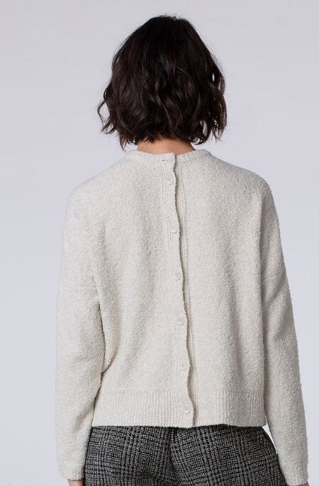 Der Pullover ist aus einem kuscheligen Bouclégarn in Baumwollmischung gestrickt und hat am Rücken eine Knopfleiste, die nach Belieben vorne oder hinten getragen werden kann. Er hat weit überschnittene Schultern und fällt locker und gerade bis über die Taille. Der Pullover lässt sich gut mit Jeans oder Cordhosen kombinieren.