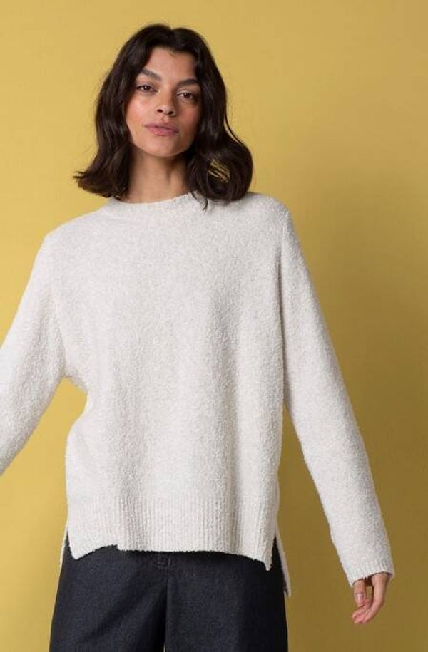 Der Pullover zeichnet sich durch das weiche, haptisch ansprechende Bouclégarn in Baumwollmischung aus. Er ist locker und leger geschnitten und fällt über die Hüften. Schmale Schultern und ein Rundhalsausschnitt machen ihn feminin, während gestufte, hohe Rippenabschlüsse mit Schlitzen diesem OSKA Essential die besondere Note geben.