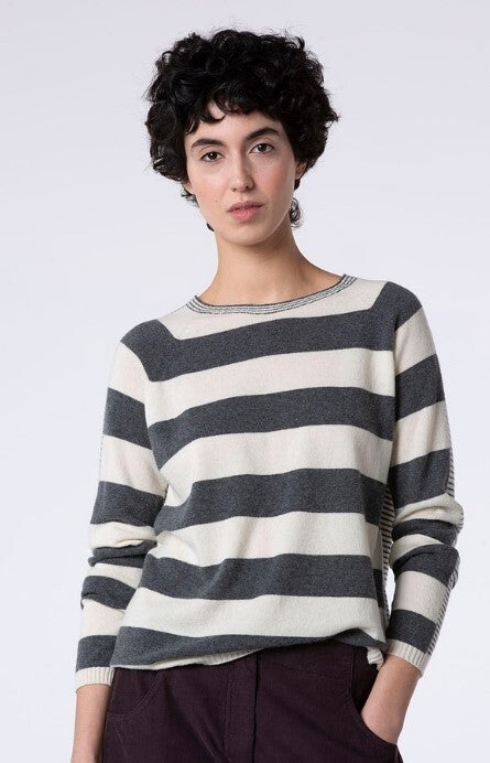 Dieser nahtlos gestrickte Streifenpullover aus extrafeiner Merinowolle vereint hohen Tragekomfort mit einem modernen Design. Die breiten Streifen auf der Vorderseite kontrastieren harmonisch mit den feinen Streifen auf der Rückseite. Die schmale Silhouette verleiht ihm eine feminine Note. Ein zeitloses Stück, das sich vielseitig kombinieren lässt.