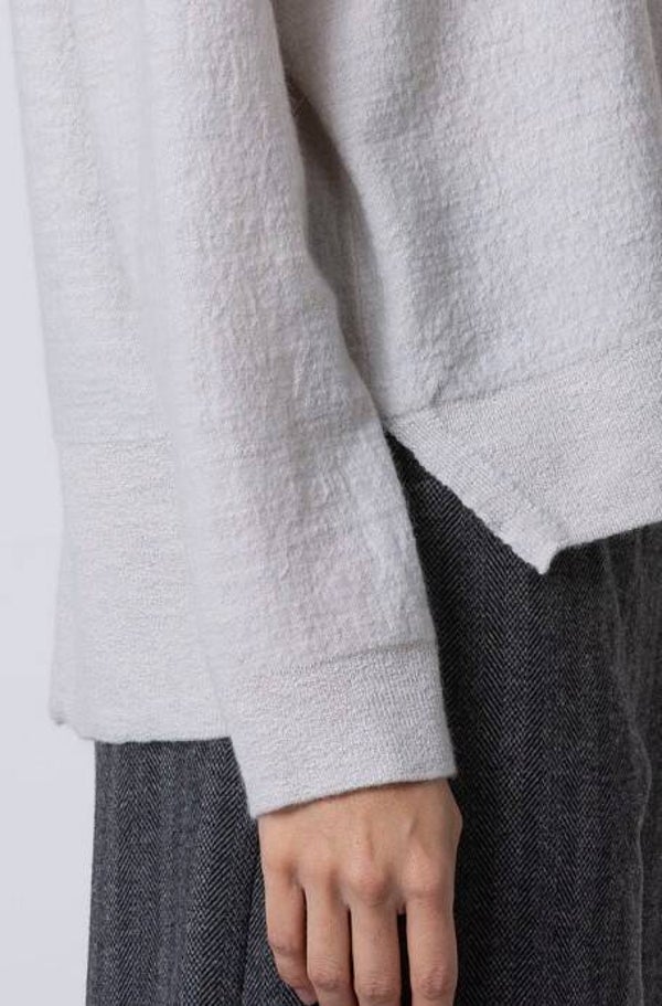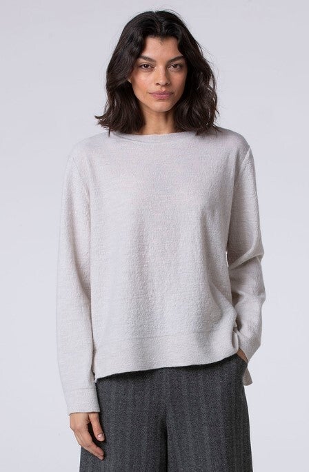 Der hüftlange Pullover mit Rundhalsausschnitt hat eine bequeme, legere Passform und ist aus reiner, mulesingfreier Merinowolle gestrickt. Für einen besonderen Look wurde er im Teil gewalkt. Passende Schultern, Rippdetails und ein Stufensaum mit längerem Rückteil unterstreichen die zeitlose Silhouette. Kombiniert mit einem Rock aus dem gleichen Material ergibt sich ein zeitlos moderner Look.