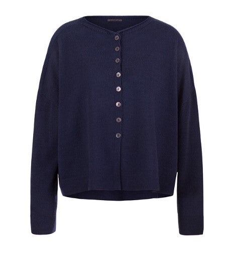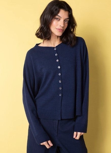 Diese nahtlos gestrickte Jacke aus reiner Merinowolle verbindet hohen Tragekomfort mit einem minimalistischen Look. Der glatt gestrickte Cardigan ist kastig geschnitten und hat tief angesetzte Ärmel. Eine Knopfleiste, der Rundhalsausschnitt mit Rollkante und Rippdetails runden das Design ab.