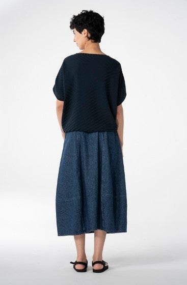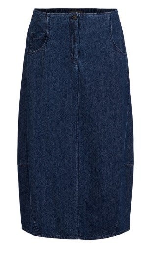 Der Rock ist aus weichem Baumwoll-Hanf Denim gefertigt und fällt leicht gerundet bis etwa zur Mitte der Wade. Die feminin geschwungenen Steppnähte und die runden Eingrifftaschen mit einer kleinen ""Watch-pocket"" sorgen für eine vorteilhafte Silhouette. Ein Reißverschluss vorne und ein elastischer Bund hinten machen den Rock besonders bequem. In Kombination mit Strick entsteht ein sommerlicher Look."